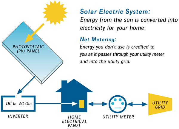 On the right is a graphic of a typical grid-tied solar electric system. There are no batteries. Any excess power you make (when the system is generating more energy than your home is using) is sold back through the utility meter, to your electricity provider. This causes your meter to spin backwards. The utility pays you the same rate that you pay them when your using energy from the grid (like every night, and on cloudy days, etc..)