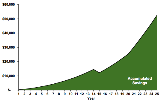* Accumulated net savings of solar system financed over 20 years, including all costs, thus showing pure cash profit.